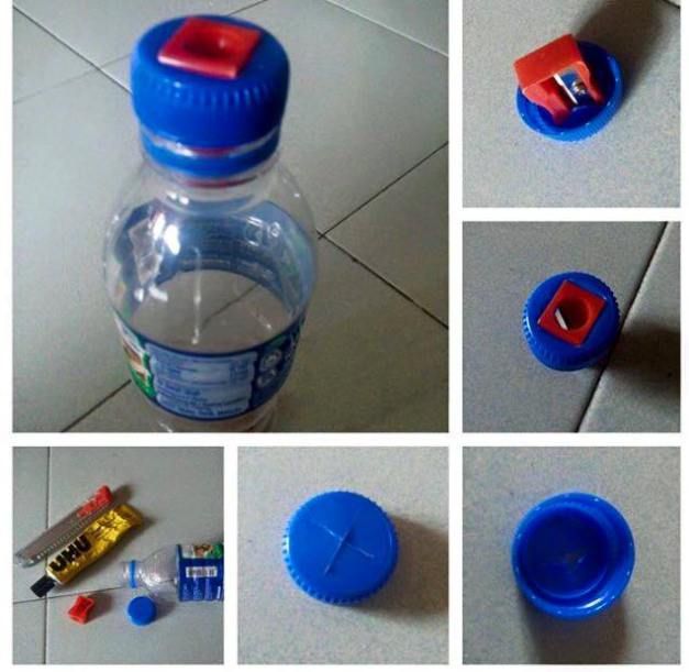- Теперь на дне бутылки сделайте отверстие, куда вы хотите вставить отрезанное ранее горлышко.