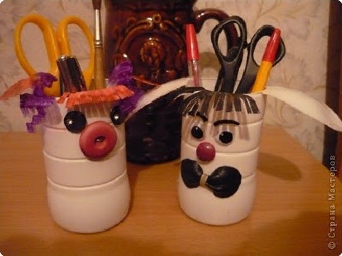 Подставка под канцелярию из пластиковых бутылокА вот подставка под карандаши в виде уютных котиков.