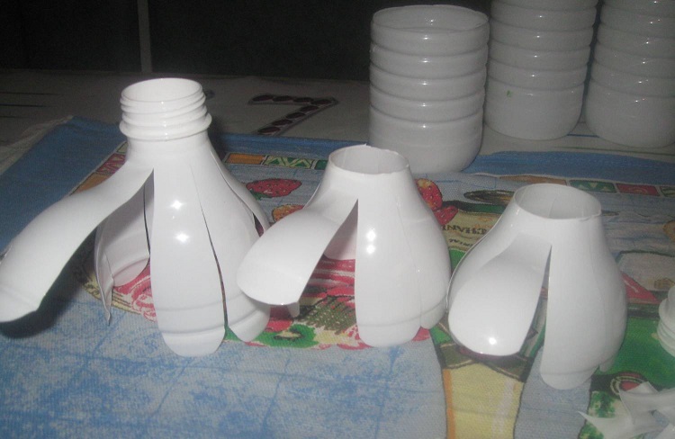 Из пластиковых бутылок можно сделать красивый букет ромашек в вазочке. Вырезаем дно у белой пластиковой бутылки. Делаем на нем надрезы, придавая форму цветка.