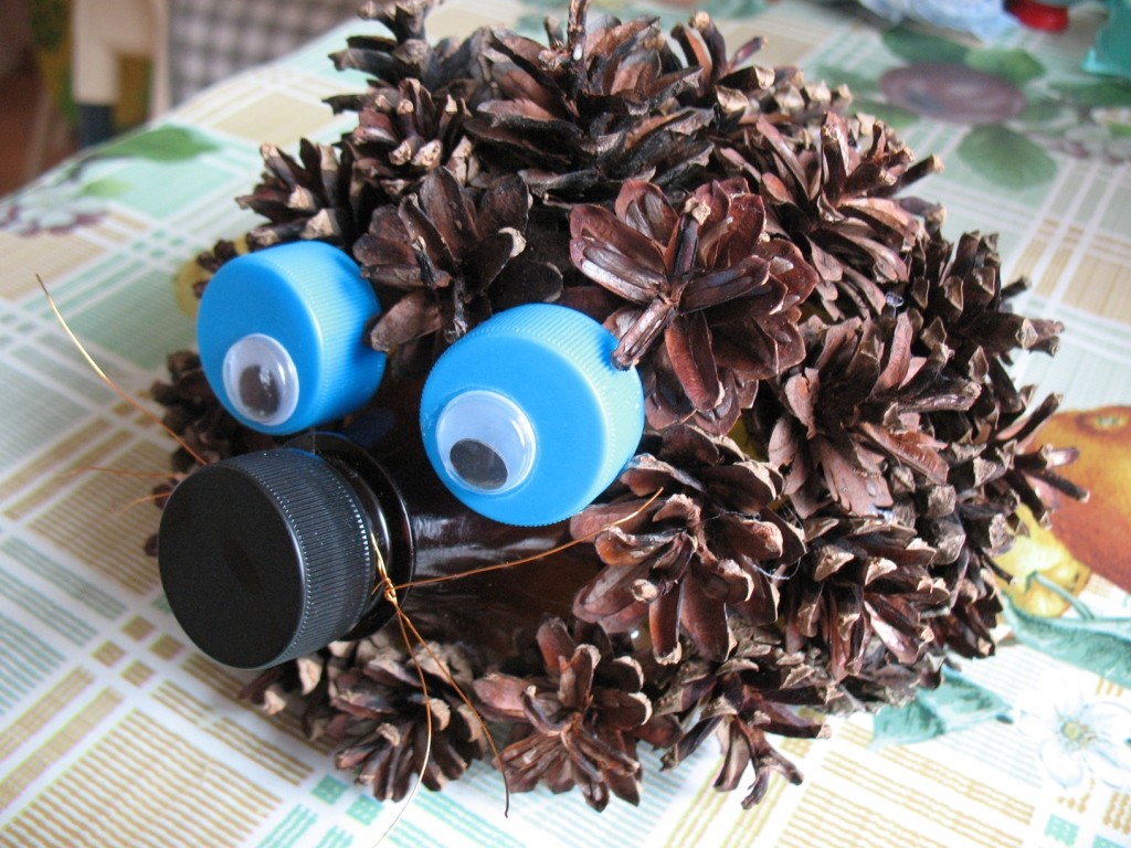 Приклеиваем на ткань шишки. Приклеиваем ежику глазки и ушки. Ежик из пластиковой бутылки и шишек — готов!
