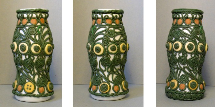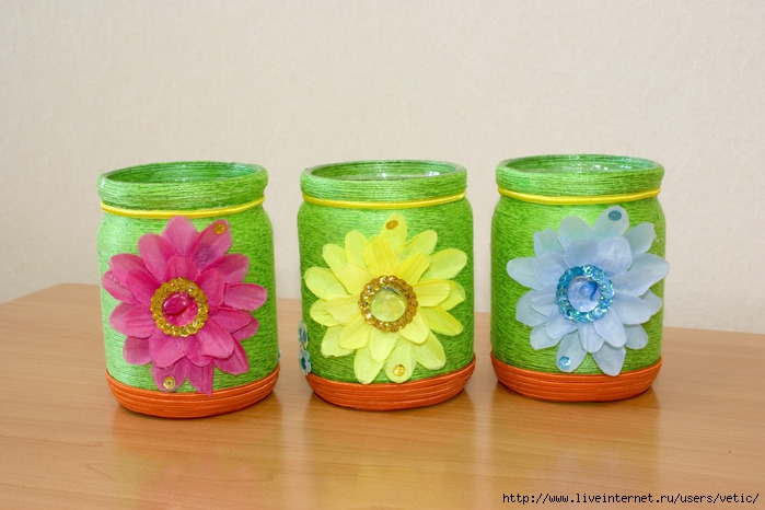 Цветы с бусинкамиПриклеиваем бантик из тесемки. Ваза из пластиковой бутылки — готова!