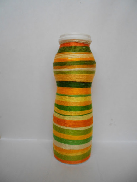 Раскрашиваем бутылкуОставшуюся часть обматываем плотной тканью. Мы немного подпалили концы ткани, чтобы не торчали нитки.