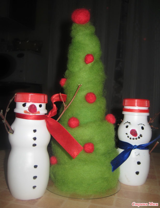 Из больших белых бутылок получаются очаровательные новогодние светильники — снеговики.