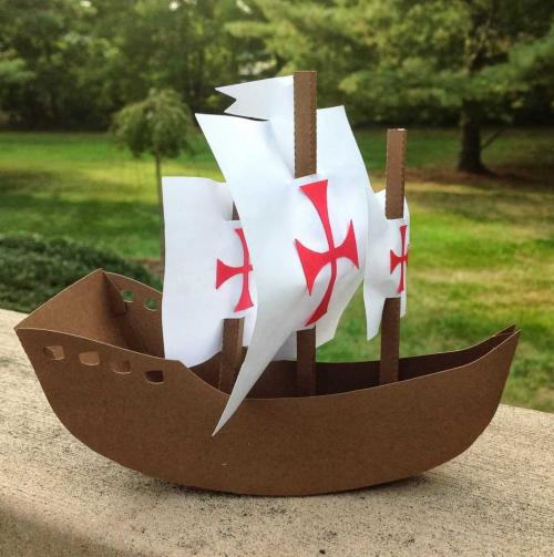- Теперь вставьте опорные стойки в окрашенную часть корабля, которая должна располагаться на дне. При этом ноги должны располагаться на одинаковом расстоянии друг от друга. Они должны позволять поделке ровно стоять на поверхности стола..