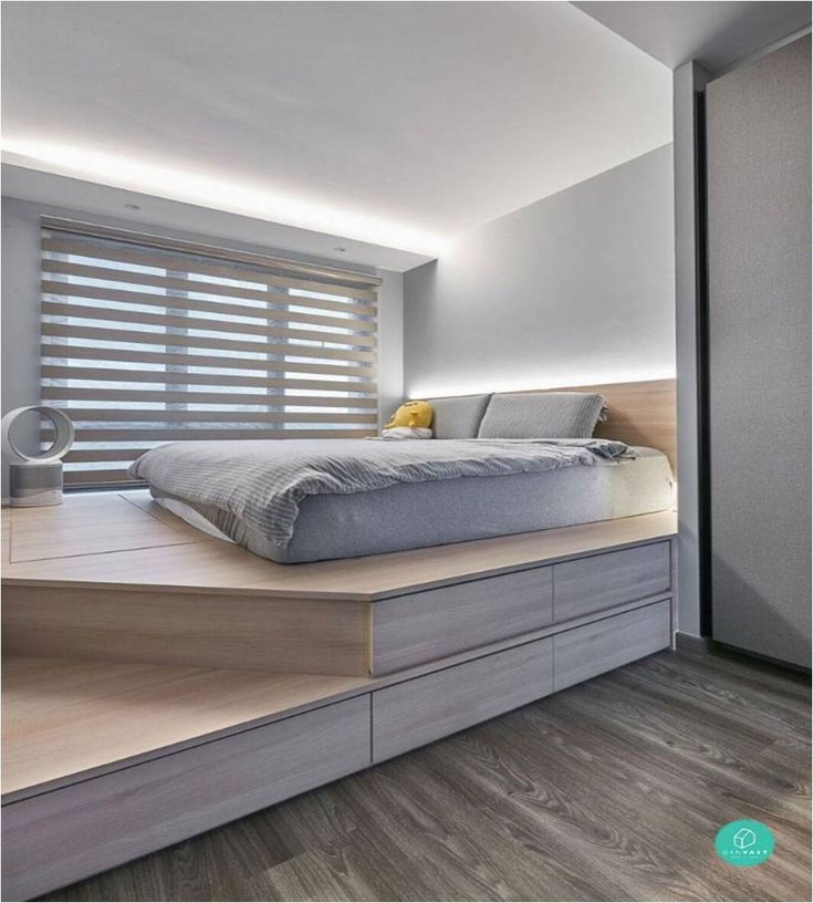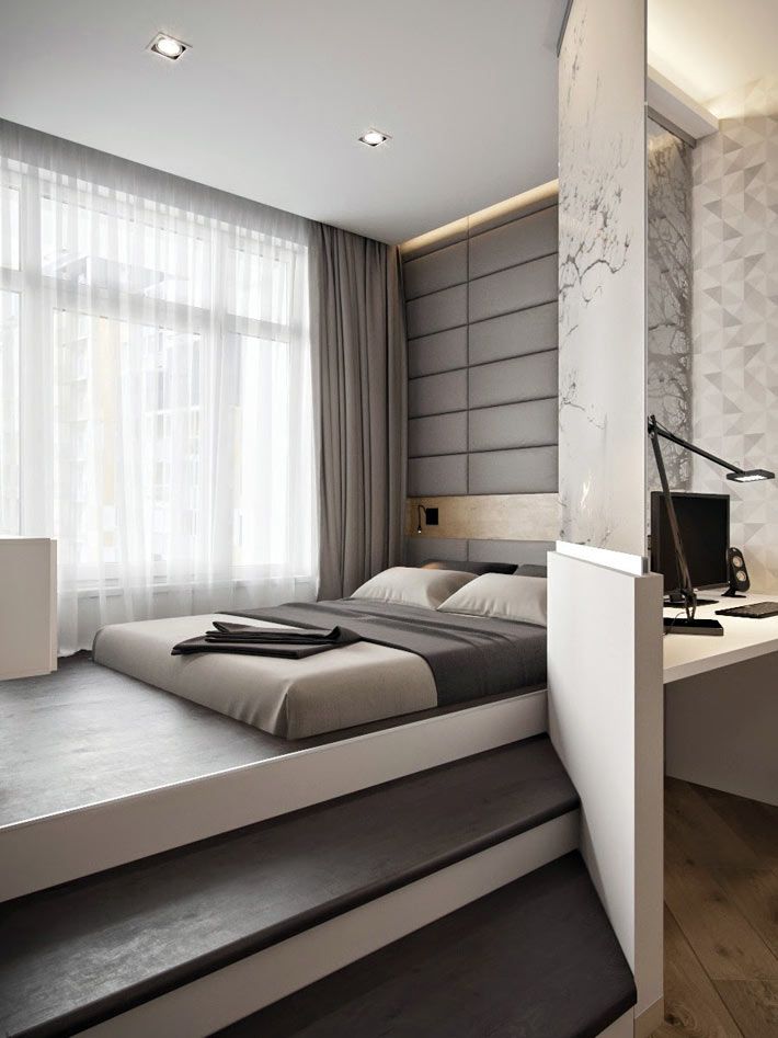 Подиум в роли кровати — универсальное решение для комнаты любого размера: в маленькой это даже сэкономит полезное пространство. Наверху подиума расположите кровать, а в основание встройте ящики для хранения.