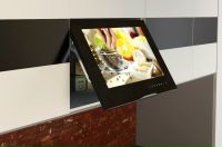 Такой телевизор удобно смотреть при шинковке овощей, при мытье посуды, сидя за столом, а если не нужен, захлопывают «крышку» и изображение исчезает. В прикрепленном к мебели основании находится вся его начинка: CD, DVD и USB, а это значит, что при желании на нем можно смотреть любимые фильмы, выводить на экран нужный рецепт приготовления блюда или же устраивать слайд-шоу из новых фотографий для гостей.
