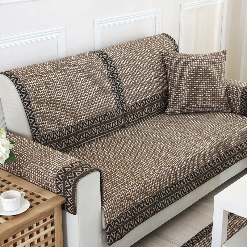 Нужно дважды подогнуть края и сшить по периметру куска материала. Полученное таким образом одеяло расстилают на поверхности дивана или кресла как обычную накидку. Преимуществом этого варианта является простота изготовления и удобство при необходимости снять для стирки. Недостатком будет образование складок в углах и на стыках бортика дивана со спинкой и сиденьем. Чтобы он был менее заметным, следует выбирать тонкую ткань. Тогда складки можно заправить вручную между частями дивана или кресла. Вы можете сделать несколько таких покрывал и легко менять их по своему желанию.