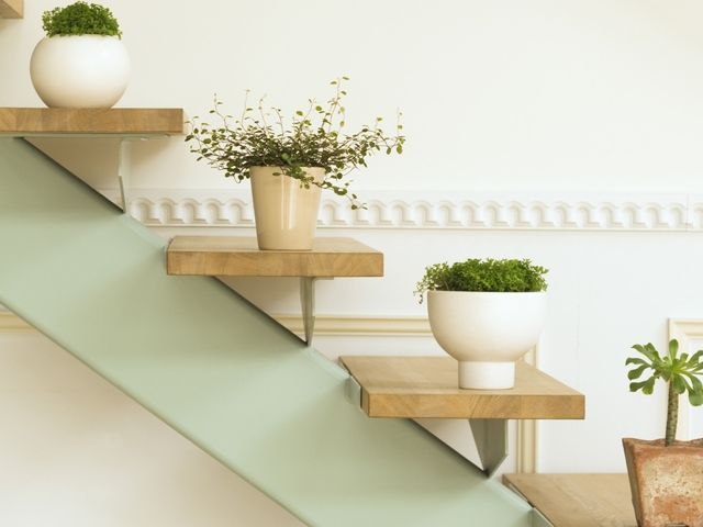 Найдите место в вашем доме с лучшим освещением для ваших комнатных растений и установите лестницу. Затем нарежьте доски или планки по ширине и расстоянию до ступеней лестницы с каждой стороны. Поместите измеренные и обрезанные доски через центр, опираясь на перекладины на противоположных концах, и вуаля! У вас есть полка для растений!