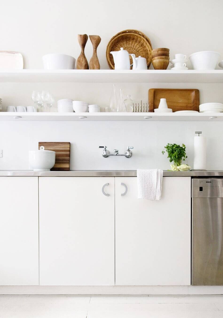 Современные кухни хорошо смотрятся в белом цвете, но все белое и прозрачное может быть немного скучным.Побалуйте себя сладостью для глаз в виде набора ярких мисок или покажите свой большой красный суповой горшок. Даже немного цвета поможет вашим открытым стеллажам выглядеть дружелюбно, а не сурово.