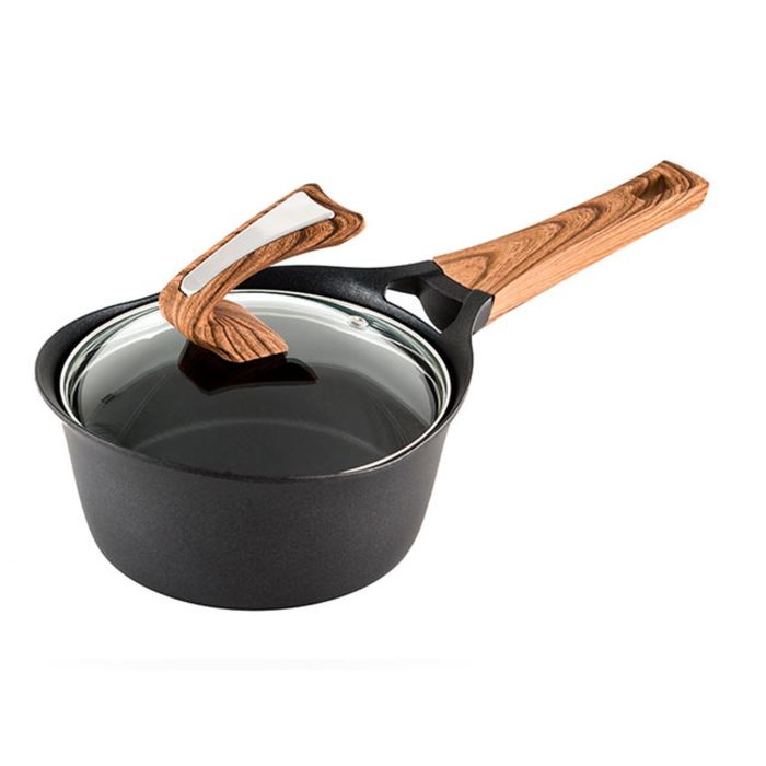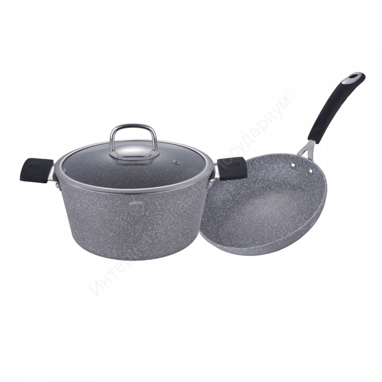Набор посуды имеет чеканную конструкцию, которая выглядит стильно и способствует равномерному распределению тепла. Кухонная посуда имеет толщину 2,5 мм, что доказывает, что она рассчитана на длительный срок службы, и оснащена удобными ручками с заклепками.