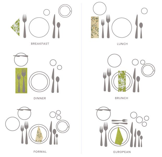 Столовые приборы следует размещать в том порядке, в котором они предназначены для использования, начиная с внешней стороны и двигаясь к тарелке. Вилки кладутся слева, а ножи и ложки — справа, причем нож ближе всего к тарелке. Всегда устанавливайте нож так, чтобы режущее лезвие было направлено к тарелке.