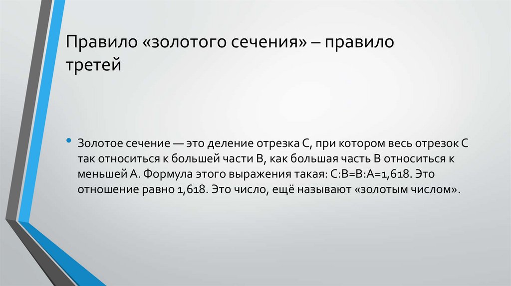 ΠΠ°ΡΠ΅ΠΌ ΠΏΡΡΠΌΠΎΡΠ³ΠΎΠ»ΡΠ½ΠΈΠΊ ΠΌΠΎΠΆΠ½ΠΎ ΡΠ°Π·Π΄Π΅Π»ΠΈΡΡ Π½Π° ΡΠ΅Π±Ρ Ρ ΠΏΠΎΠΌΠΎΡΡΡ ΠΌΠ°Π³ΠΈΡΠ΅ΡΠΊΠΎΠ³ΠΎ ΡΠΈΡΠ»Π° 1,618 Π±Π΅ΡΠΊΠΎΠ½Π΅ΡΠ½ΠΎΠ΅ ΠΊΠΎΠ»ΠΈΡΠ΅ΡΡΠ²ΠΎ ΡΠ°Π·.
