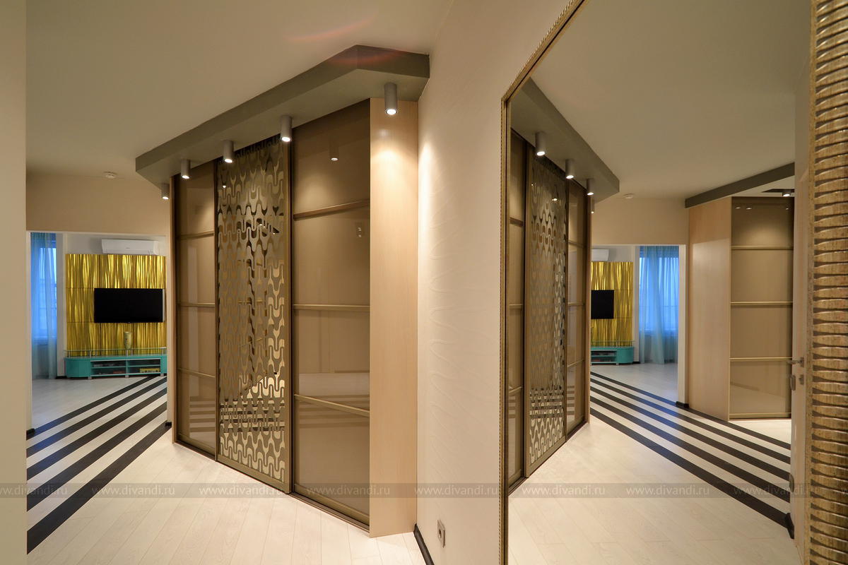 Особый декор любой встроенной прихожей – это двери, раздвижные или распашные, от пола до потолка, украшенные различными декоративными элементами. Узор на дверцах шкафа может быть исполнен из золотой или серебряной фольги. В качестве декора используется яркая фурнитура, виниловая наклейка, фотопечать.