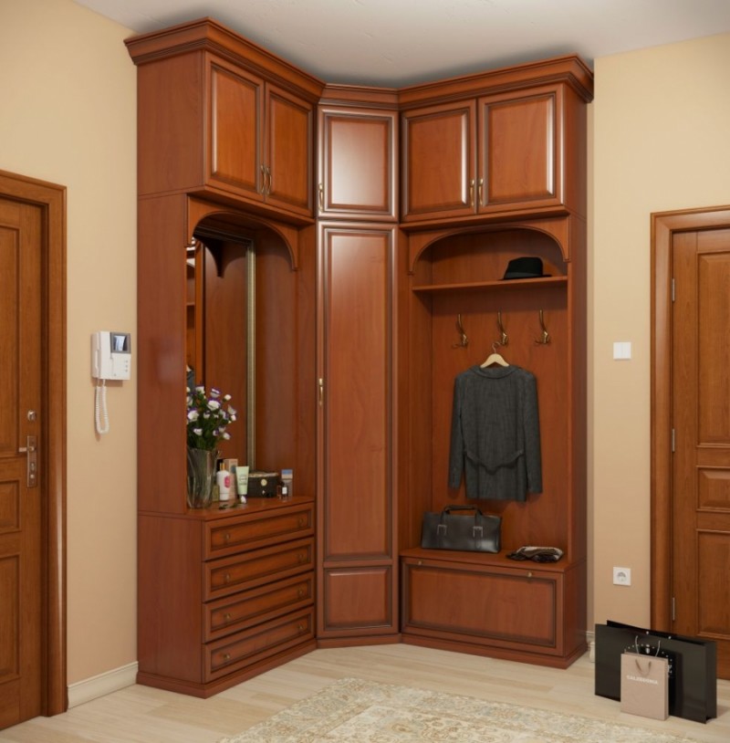 Приверженцы классики выбирают дерево, умеренные тона, массивную мебель. Угловая прихожая в классическом стиле – прекрасный выбор для квартир улучшенной планировки, сталинского ампира. Предусмотрено большое количество зеркал, мощные источники света. У обувницы устанавливают мягкое сиденье, обитое кожей или дерматином.
