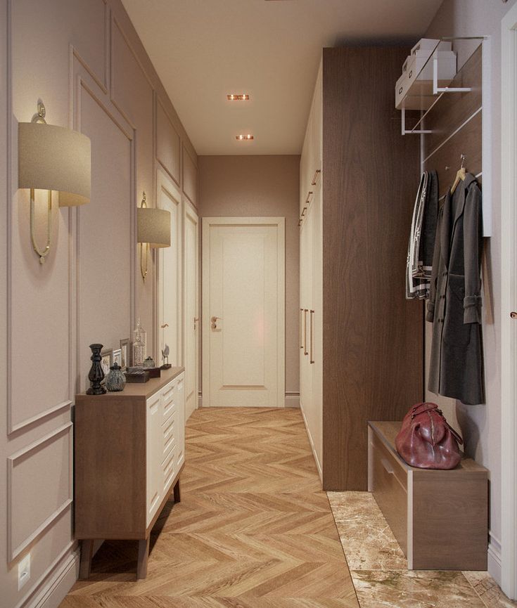 Классический стиль. Универсальный вариант, который идеально подходит для дизайна узких прихожих. Традиционным отделочным материалом для такого стиля является дерево и камень.