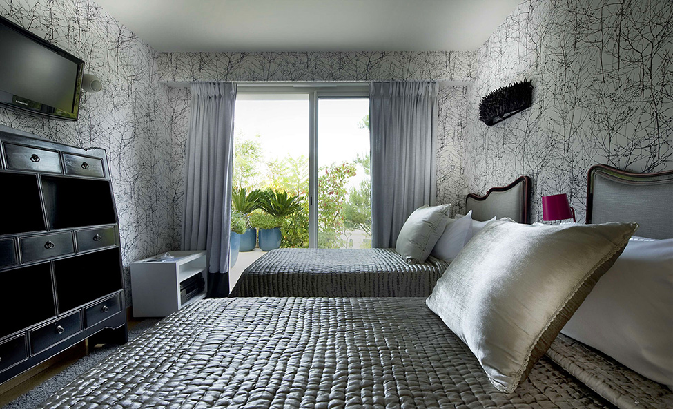 Помещение спальни подходит для оформления рулонами с крупным рисунком, выраженной фактурой и дополнительным блеском (шиммером, стразами, шелкографией). Обстановка спальни ограничивается кроватью или диваном, платяным шкафом и прикроватными тумбочками, поэтому стены оформляют яркие орнаменты крупных размеров.