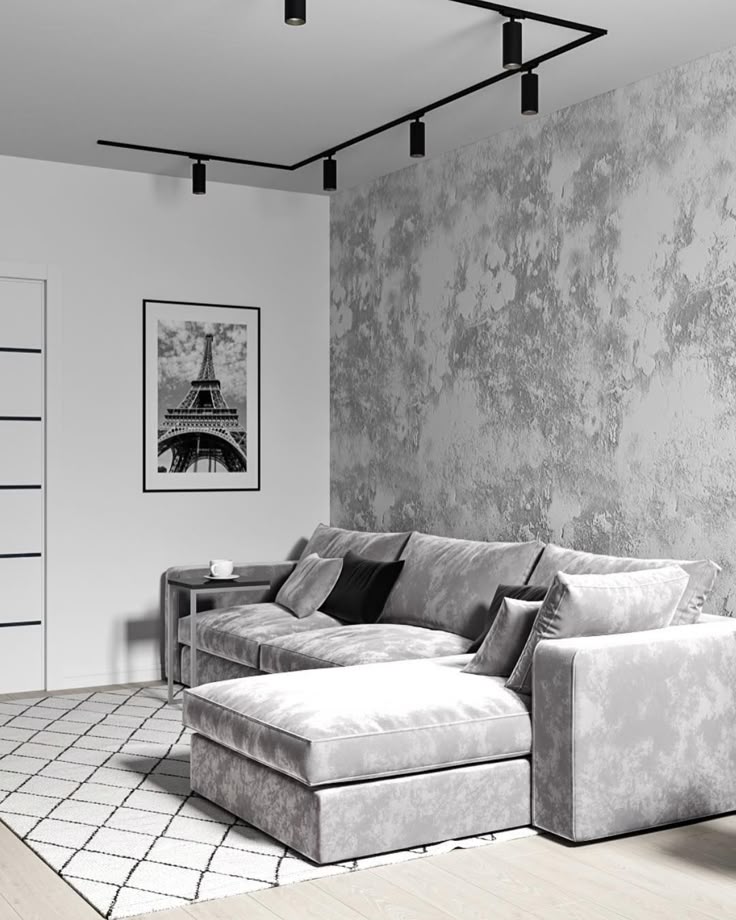 Например, плавные переходы серого оттенка выполняют с помощью декоративной штукатурки, нейтральную серую стену легко создать с помощью тонких бумажных полотен.