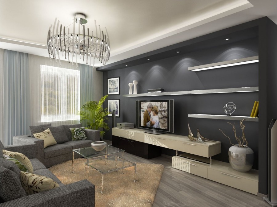 Оттенок. Стены гостиной можно оклеить более глубокими оттенками серого цвета: графитовым, серо-зелёным.