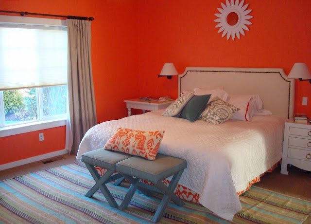 Оранжевые акценты делают акцент, а стены персикового цвета смягчают общий дизайн.