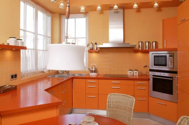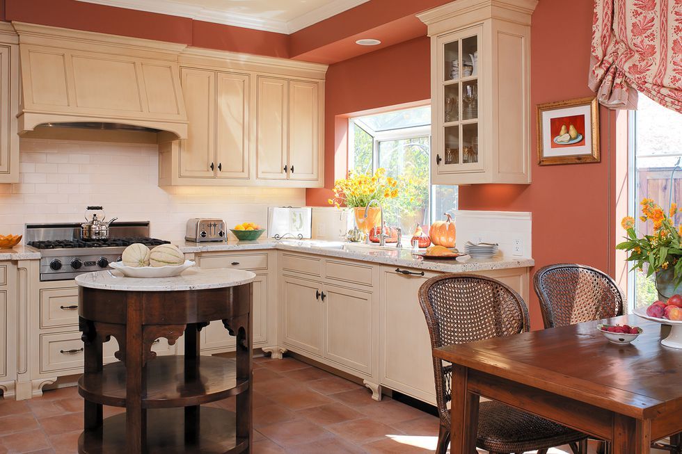 На кухне персиковый цвет возбуждает аппетит, нужно только использовать сочные активные тона.