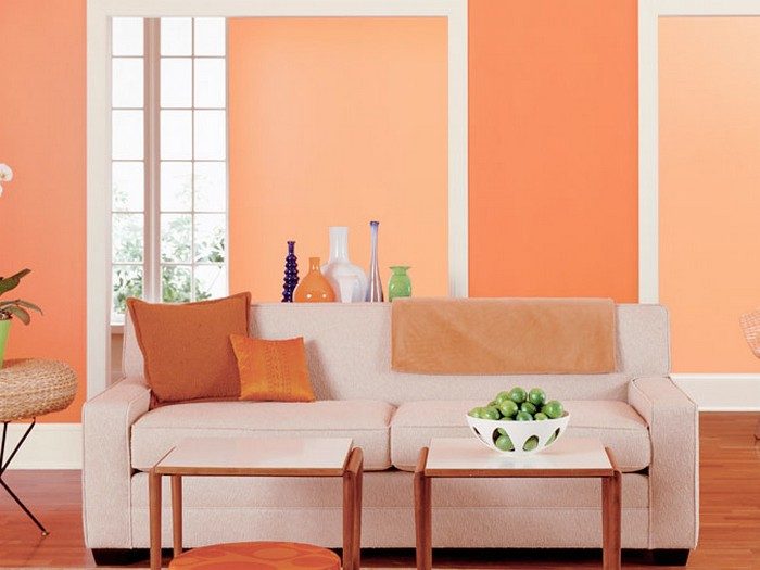 Стена персикового цвета с оранжевым декоромКак бы вы хотели, чтобы в вашем доме было мило и по-летнему? Вы можете добиться такого эффекта, сочетая оранжевые акценты с персиковыми стенами.