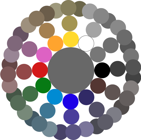 - при смешивании двух цветов, располагающихся по хорде цветового круга, будет получен промежуточный тон,