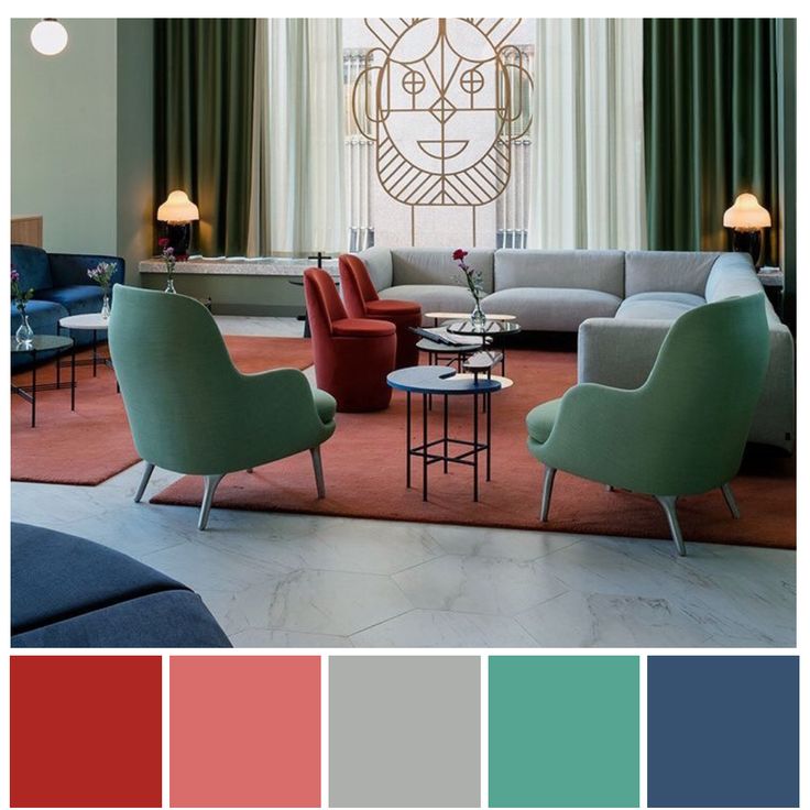 Красный и серый – припыленные, очень элегантные, их нельзя назвать в полном смысле слова глубокими, но они и не плоские, в них есть мерцание. И посмотрите, как хорошо их дополняет столь же элегантный припыленный синий цвет. А нежно-сиреневый придает интерьеру свежесть.