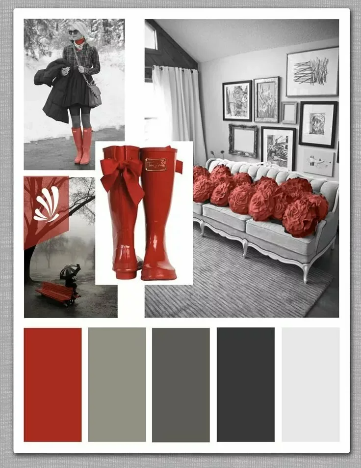 Люди чувствуют потенциал сочетания красного и серого, но распределить его так, чтобы это было красиво, очень трудно, потому что это очень требовательное сочетание. Давайте посмотрим на него повнимательнее и поймем, оно нам надо или нет.