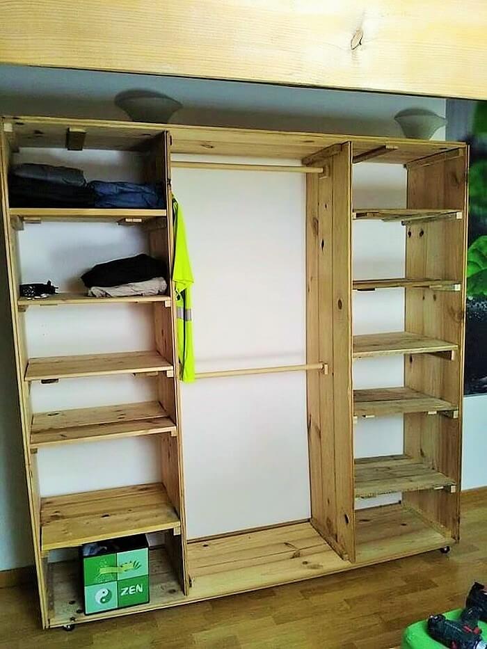 Из деревянных паллет можно своими руками сделать оригинальный шкаф для хранения одежды. Изделие получается комфортным в использовании, так как имеет просторные полки и удобные выдвигающиеся ящики.