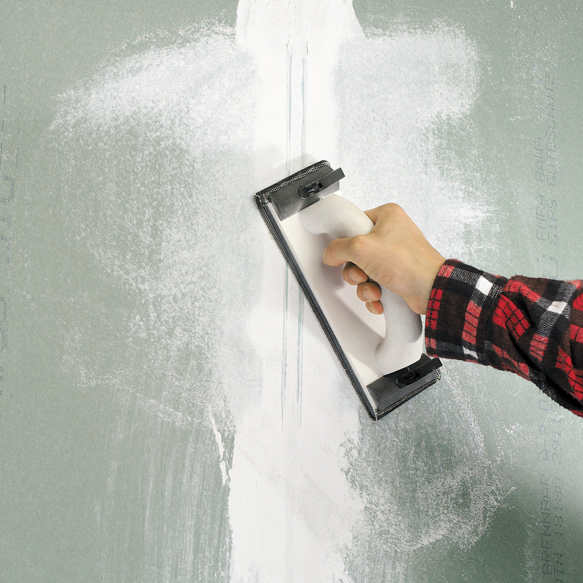 Его листы вырезаются по форме стен, а затем прибиваются гвоздями. Затем обычно добавляют три слоя шовного герметика, и после каждого слоя стена шлифуется, чтобы получить более гладкую поверхность. После высыхания третьего слоя стена готова к покраске.