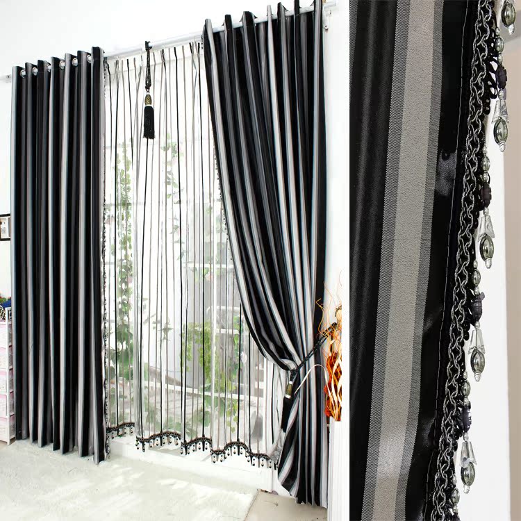 При подборе рулонных, римских штор или жалюзи следует избегать их выполнения в одном тоне. Более уютной комнату сделают чёрные шторы с рисунком, который выполнен светлыми красками и серебром.