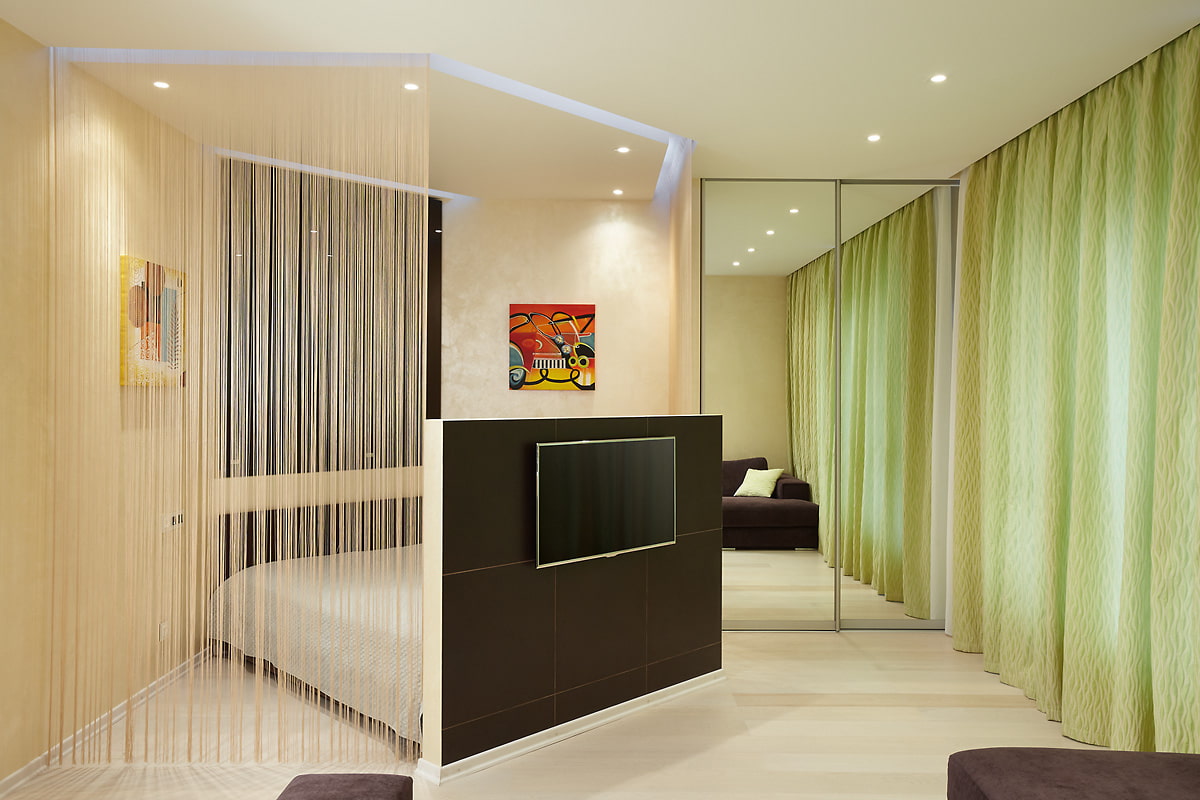 Изоляция при помощи занавесок спальной области в однокомнатной квартире сформирует ощущение уединения. Сделать его можно в виде классической портьеры или балдахина над спальным местом на входе в зону спальни. Главная особенность, которая будет приятна любителям всего нового, заключается в том, что шторы можно периодически заменять. Регулярно выбирая новый материал, цвет и дизайн штор, вы придадите всему помещению новый модный стиль. Помимо этого, созданы двусторонние шторы, предполагающие перемену визуального пространства, целью которого – придать каждой зоне свой неповторимый стиль.
