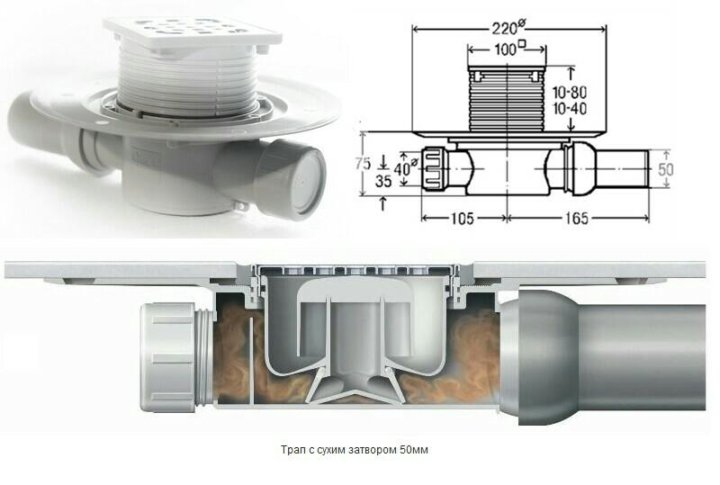 Вне зависимости от типа, конструкция оснащается специальной сифонной конфигурацией или затвором, предотвращающим попадание канализационного запаха в помещение: