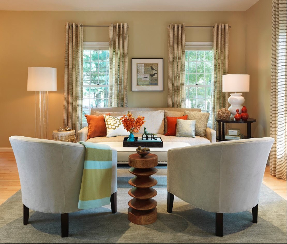 Светло-голубой вносит нотку спокойствия, а бежевый помогает сохранить в комнате ощущение тепла и уюта. С другой стороны, использование оттенков желтого или оранжевого с бежевым может создать в гостиной веселую атмосферу, которая оживит беседу.