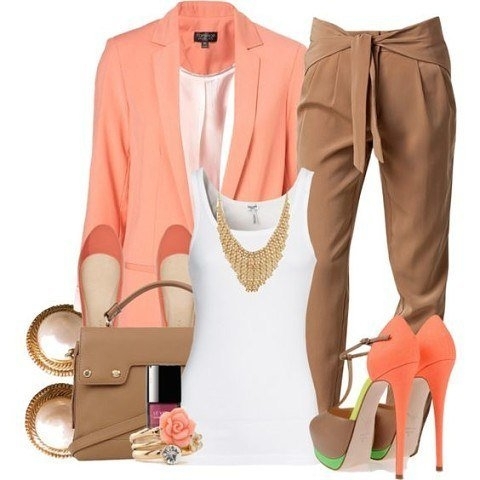 Если возникли затруднения в выборе комплекта, то выручит белый. Он сочетается практически со всем, и персиковый цвет не исключение. Образ получится невесомым и воздушным, что демонстрируют фото. Эффектно смотрятся белые брюки и фруктового, теплого розового, оттенка блузка или наоборот.