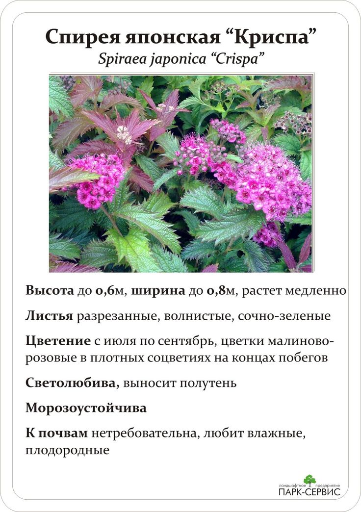 Спирея японская Мэджик Карпет карликовый кустарник до 50 см высотой и диаметром до 80 см с очень декоративной окраской листьев. Крона подушковидная, плотная. Листья до 5 см длиной, при распускании медно-красные, яркие, позже становятся желтыми. Осенью листва вновь приобретает красно-оранжевые оттенки. Цветки розовые, собраны в щитковидные соцветия до 5 см в диаметре. Цветение обильное и продолжительное на побегах текущего года с июня до сентября. Рекомендуется весенняя обрезка, обрезка отцветших соцветий, стимулирующая более продолжительное цветение. Светолюбива, к почвам нетребовательна, морозостойкая, дымо- и газоустойчива