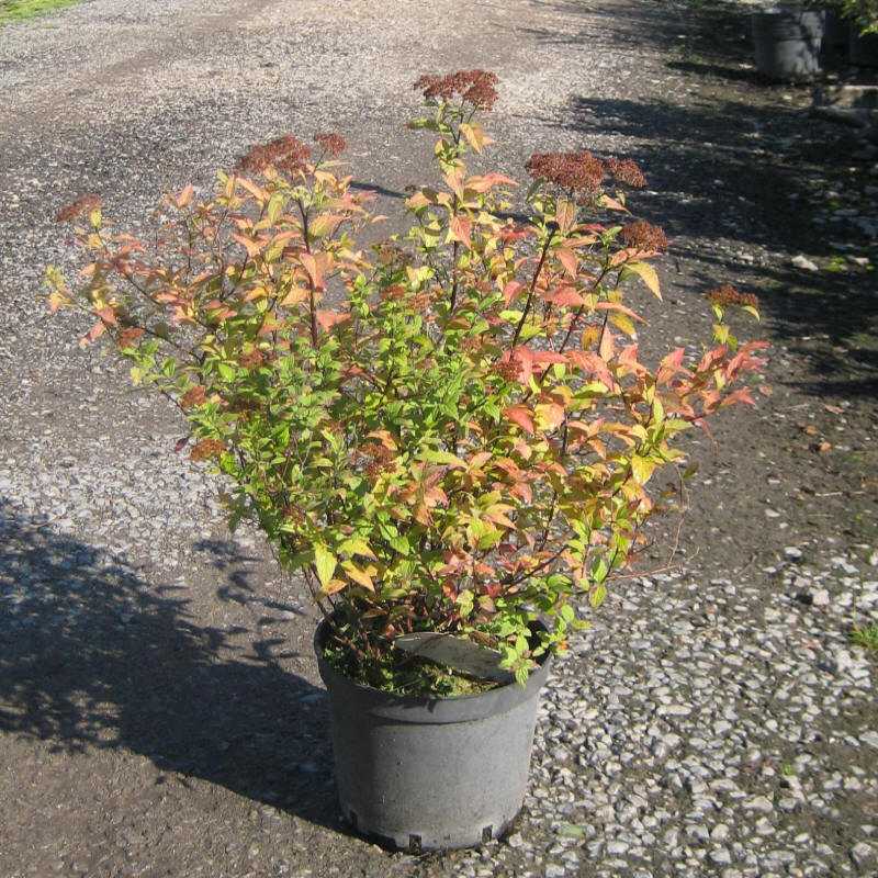Затем они становятся ярко-желтыми, потом желто-зелеными на момент цветения. После цветения огненные краски листвы возвращаются. Отличается многократным изменением оттенков желтой окраски листвы в течение сезона. Осенняя окраска листьев — медно-оранжевого с золотом (на кислых почвах — ярче, добавляется пурпурный цвет). Иногда на кусте появляются пестрые листья. Листья продолговатые, по краю зубчатые, 5-8 см длиной. Медленно растущее, годовой прирост 0,1 м в высоту и 0,1 м в ширину. Цветки мелкие, ярко-розовые, собранные в щитках. Период цветения: конец июня – середина августа, средняя продолжительность цветения – 50 дней, цветение обильное.Хорошо переносит умеренные морозы и не доставит особых хлопот тем, кто не имеет возможности создавать специальные укрытия. Сорт светолюбив, но выносит и полутень, яркую окраску листья приобретают на солнечных участках, в тени они зеленеют.
