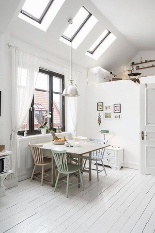 Окна из свинцового стекла пропускают воздух и естественный свет и освещают комнаты. Для лучшей вентиляции повесьте на окна кружевные шторы. Потолки должны быть высокими. В типичном скандинавском стиле — деревянный пол. Вы можете бросать на пол коврики большого размера. Если вы хотите выделить свой интерьер среди других, выберите для пола необычный выбор дерева, например, клен или ироко.
