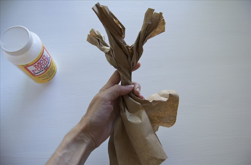 Сделайте ствол дерева. Перекрутите нижнюю часть пакета до сделанной ранее метке. Донышко пакета сформирует более широкое основание дерева, а в области метки бумага должна быть скручена достаточно туго.