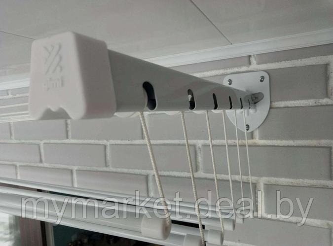 Более длинный шнур пропускается через левый кронштейн. Далее шнур повторно пропускается через правый кронштейн. После этого два шнура пропускаются через фиксаторы на скобе. Это даст возможность регулировать верхнее и нижнее расположение веревок устройства для сушки.