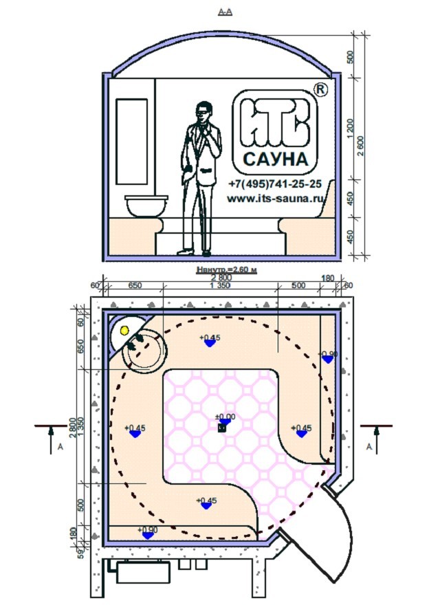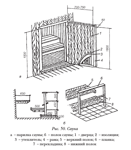 Печь располагают на высоте 1–1,5 метра над полом, а скамейки располагают выше. Потолок должен располагаться на расстоянии не менее чем на 1,1 метра над верхней точкой платформы, на которой будут сидеть люди.