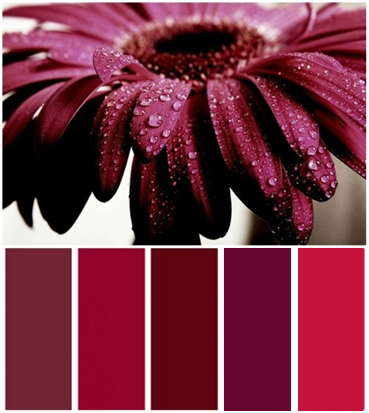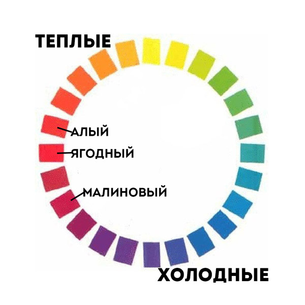 Холодные оттенки красного: вишневый, малиновый, клюквенный, винный, бургундский, рубиновый, пурпурный, бордовый, свекольный, черешневый.