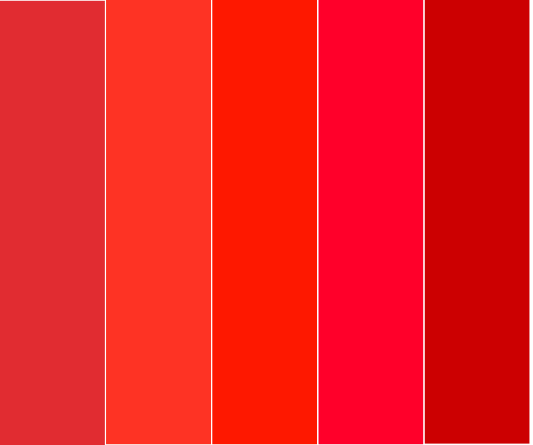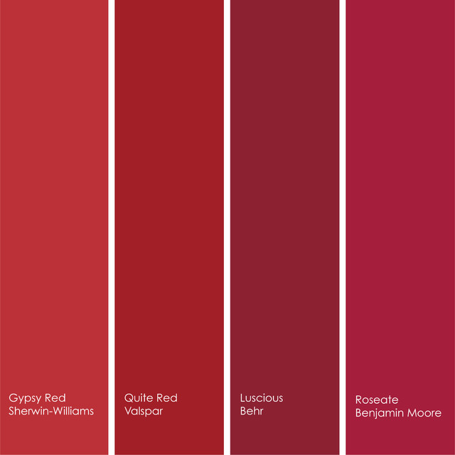 (1) Средне-красный, (2) темно-красный, (3) красное дерево, (4) ярко-красный, (5) красно-оранжевый, (6) алый, (7) китайский красный, (8) кораллово-красный, (9) терракотово-красный, (10) гранатовый, (11) ржавчина, (12) фалунский красный,(13) красная земля, (14) ализариновый, (15) красный цикорий, (16) кардинал, (17) томатный, (18) скарлет, (19) портвейн, (20) красно-бордовый.