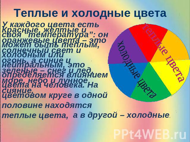 Запомните – тёплые оттенки постепенно переходят в оранжевый (жёлтый + красный = оранжевый), холодные – в зелёный (жёлтый + синий = зелёный).