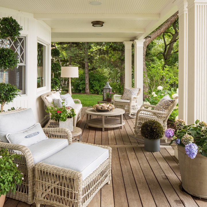 - Используйте натуральные материалы. Это позволит создать атмосферу загородного дома. Деревянный настил и натуральный камень будут смотреться естественно, а также легко справятся с любыми природными явлениями. Это же касается и мебели. Плетёные кресла, столы и стулья из ротанга комфортны и подарят ощущение уютного сада.