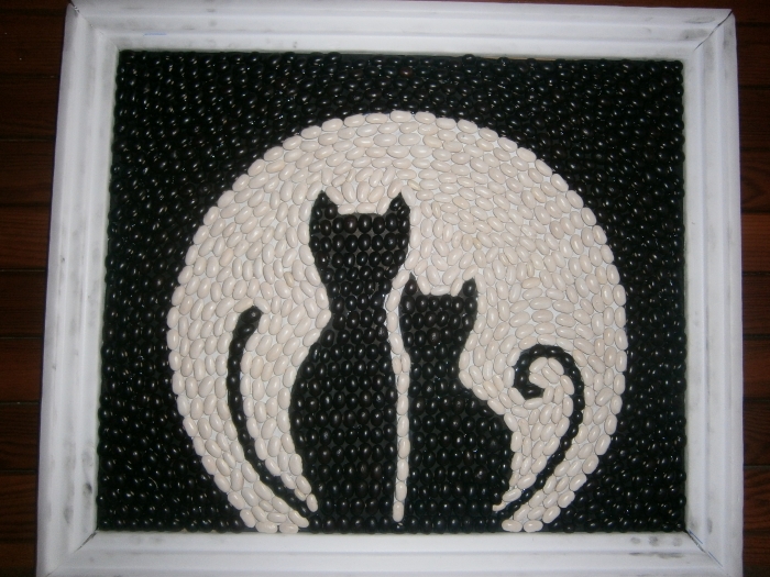 Поделки из фасоли популярны и среди взрослых. Если вы хотите украсить квартиру необычным объемным панно, найдите красивый трафарет и используйте эту технику для его заполнения.