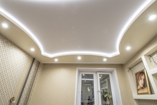 Многоуровневый потолок нередко дополняют светодиодной лентой. Особенно эффектно потолок с подсветкой будет смотреться в гостиной или коридоре.