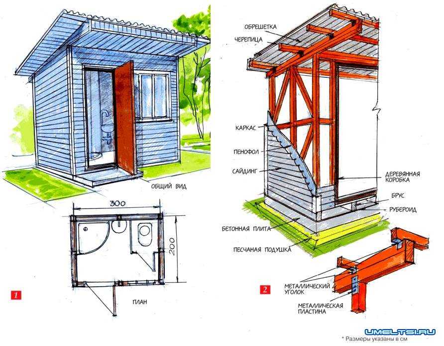 Простота конструкции позволяет обустроить туалет на даче своими руками чертежи, и типоразмеры которого, можно изучить в каталогах фирм или рассчитать самому. Древесина самый популярный и доступный материал, простой в обработке и не требующий специального инструмента для постройки. Сама конструкция состоит из каркаса, обшитого доской и накрытого кровельным материалом.