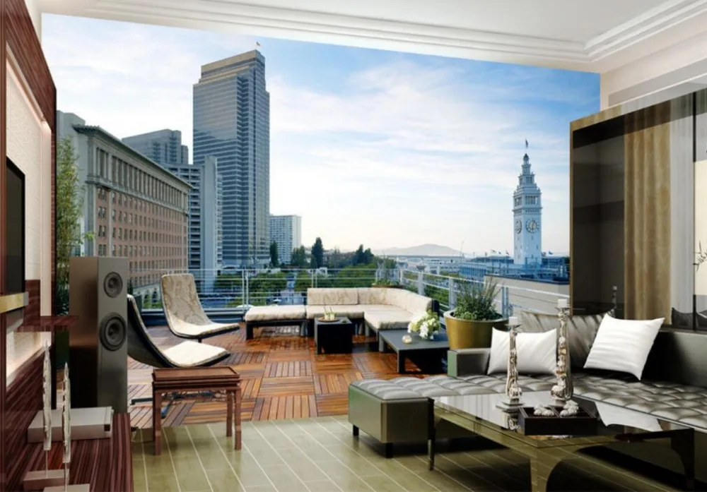 Расширяющие фотообои с террасой или балконом создают иллюзию еще одного пространства, которое зрительно продолжит комнату.