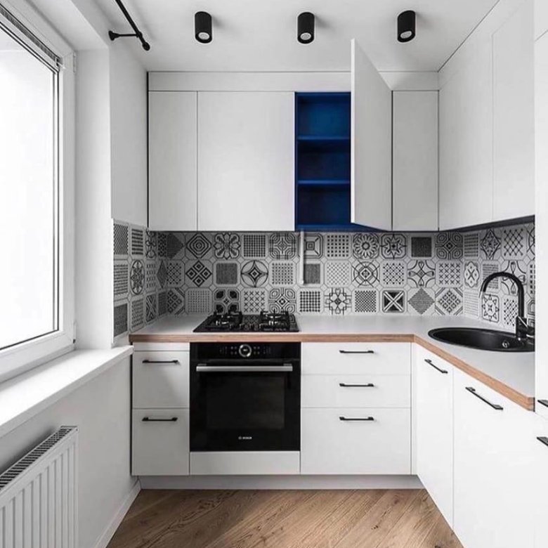 Компактность. В отличие от п-образных кухонных гарнитуров угловой не занимает практически всю и без того небольшую кухню. Он оставляет достаточно места для перемещения при готовке, при этом в противоположном углу можно предусмотреть место и для приема пищи. Кроме того, в п-образной кухне маленького размера есть риск конфликта при открывании фасадов, поскольку хочется вместить все и сразу на небольшой площади. В угловой модели такой риск ниже, и предусмотреть все возможные проблемы гораздо проще.